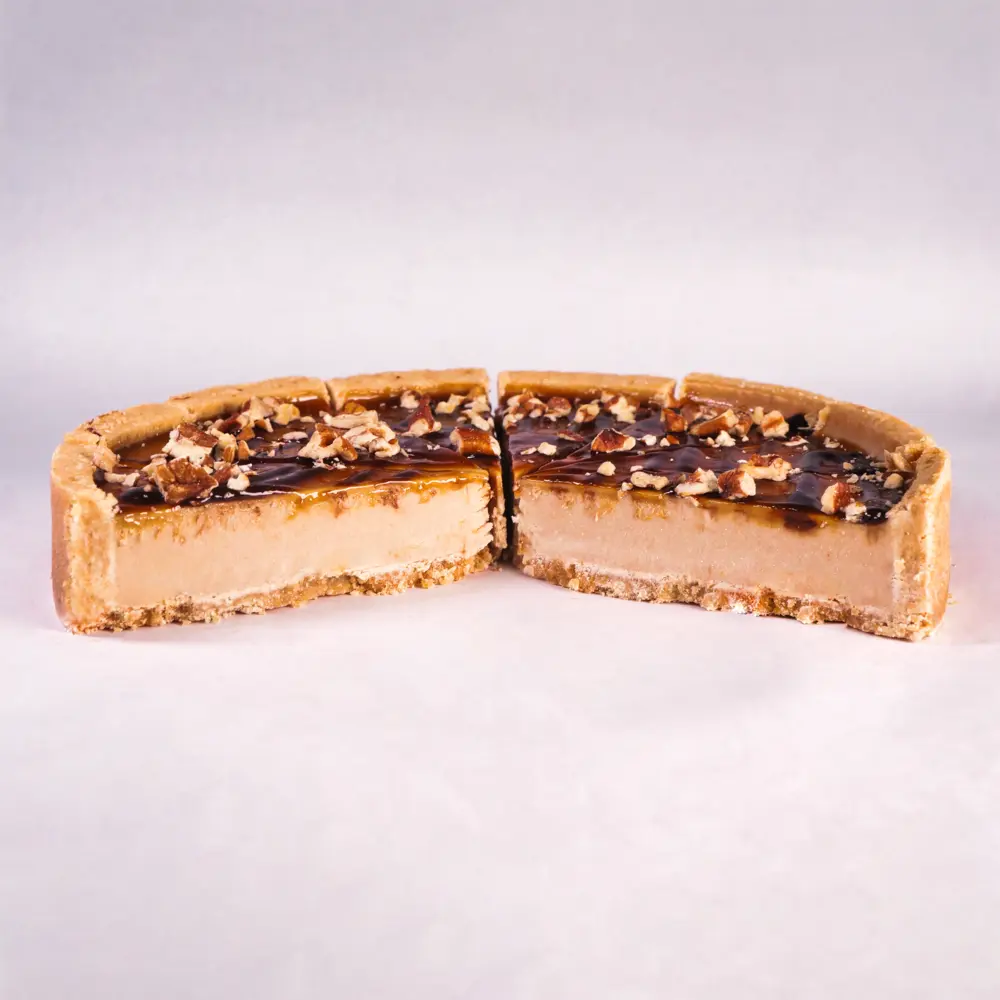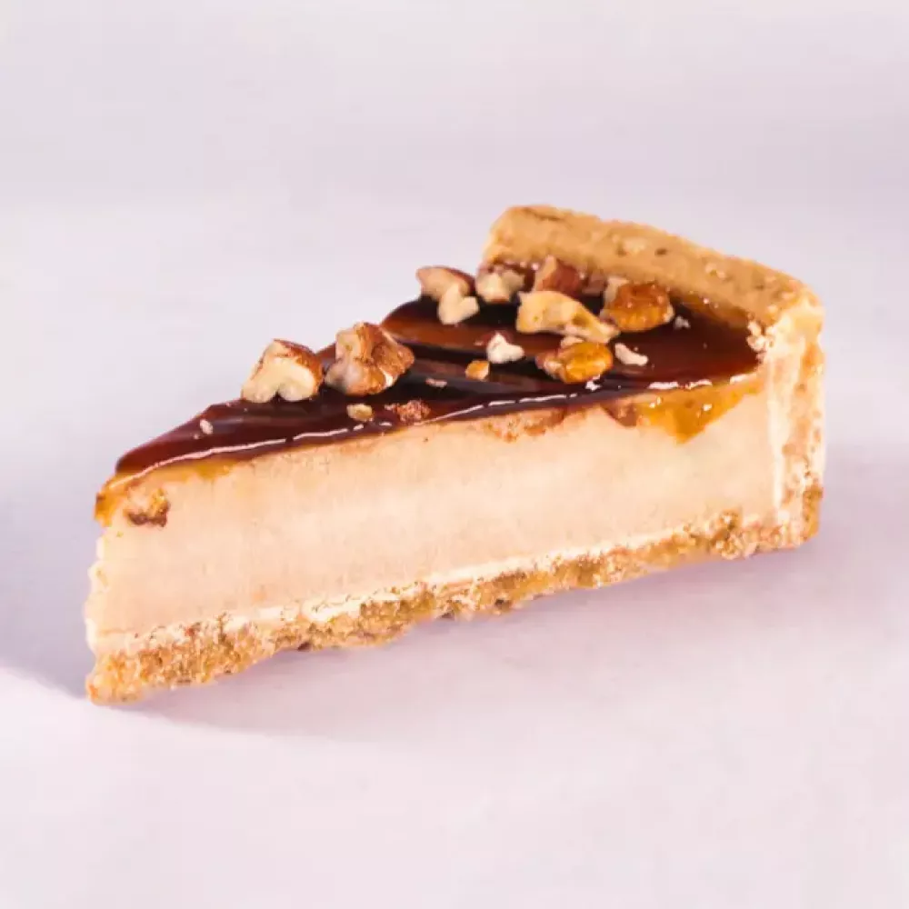 Изысканный сливочный десерт на основе коржа из песочного печенья и нежного творожного суфле, декорированный кленовым сиропом и крупными кусочками ореха пекан.